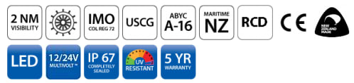 Helt forseglet for livet. IP 67 sertifisert Hver NaviLED-lampe er en fullstendig forseglet enhet, svært UV- og korrosjonsbestandig. Hus med høy slagkraft sikrer holdbarhet mot bølger og støt. NaviLED360-ankerlamper har gjennomgått omfattende "testet til ødeleggelse"-programmer for å bidra til å løfte produktets pålitelighet til en ny standard.